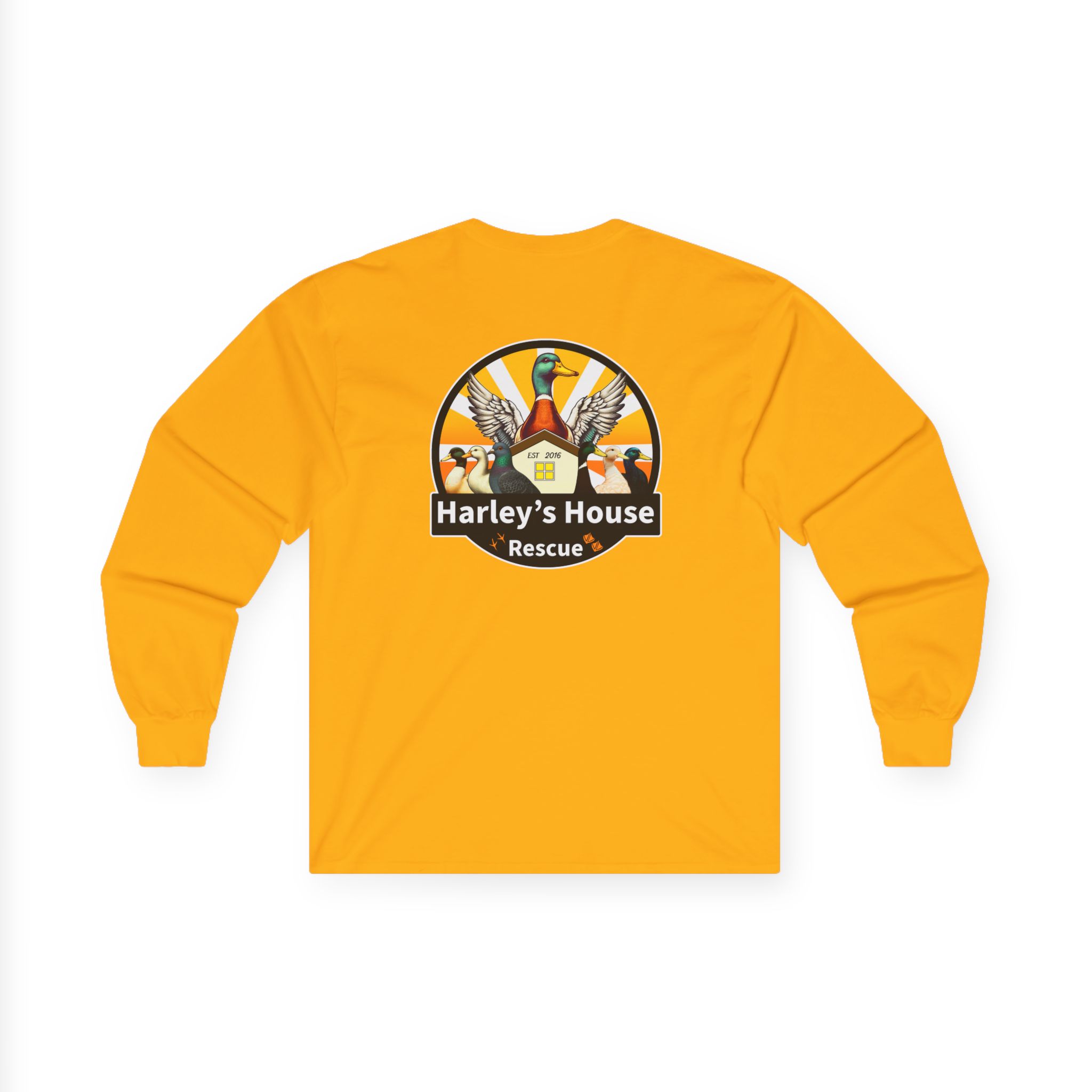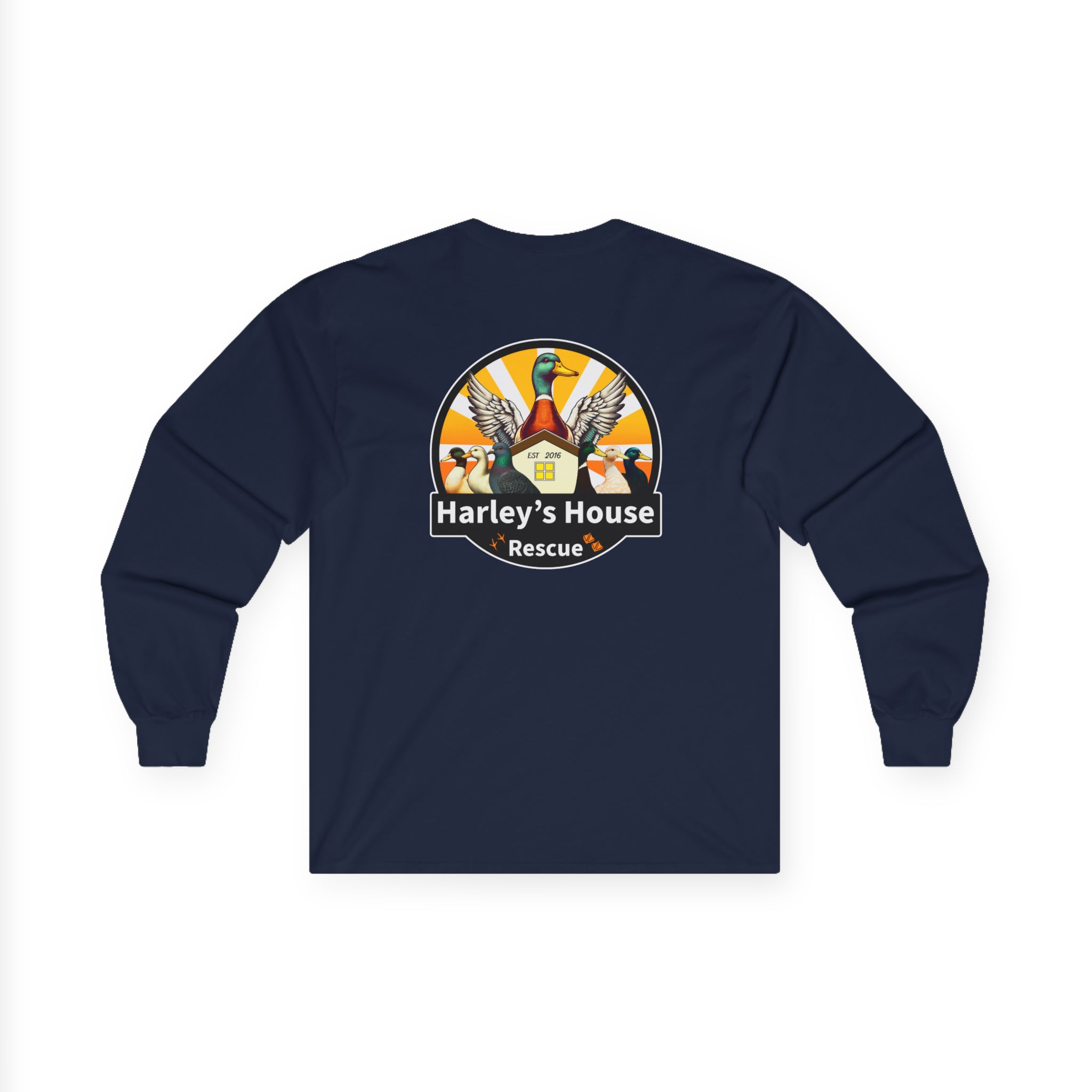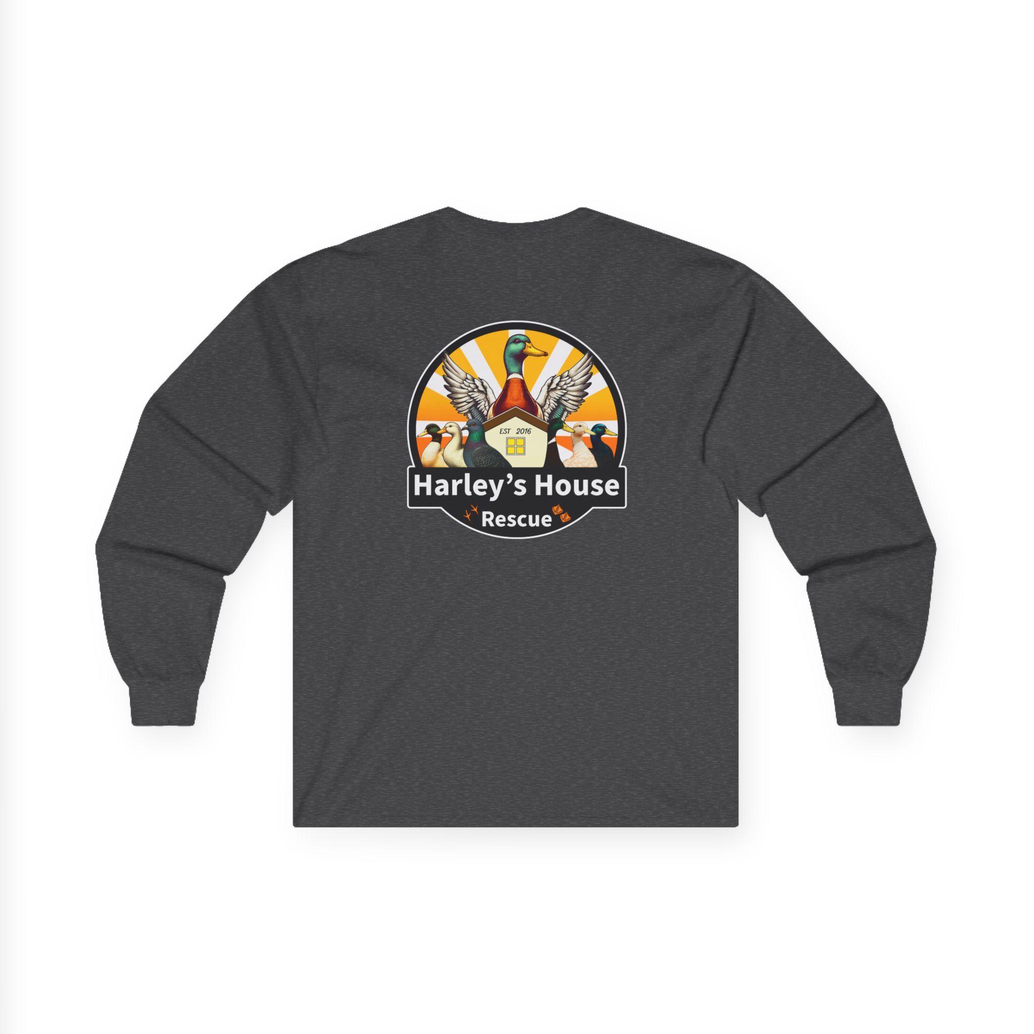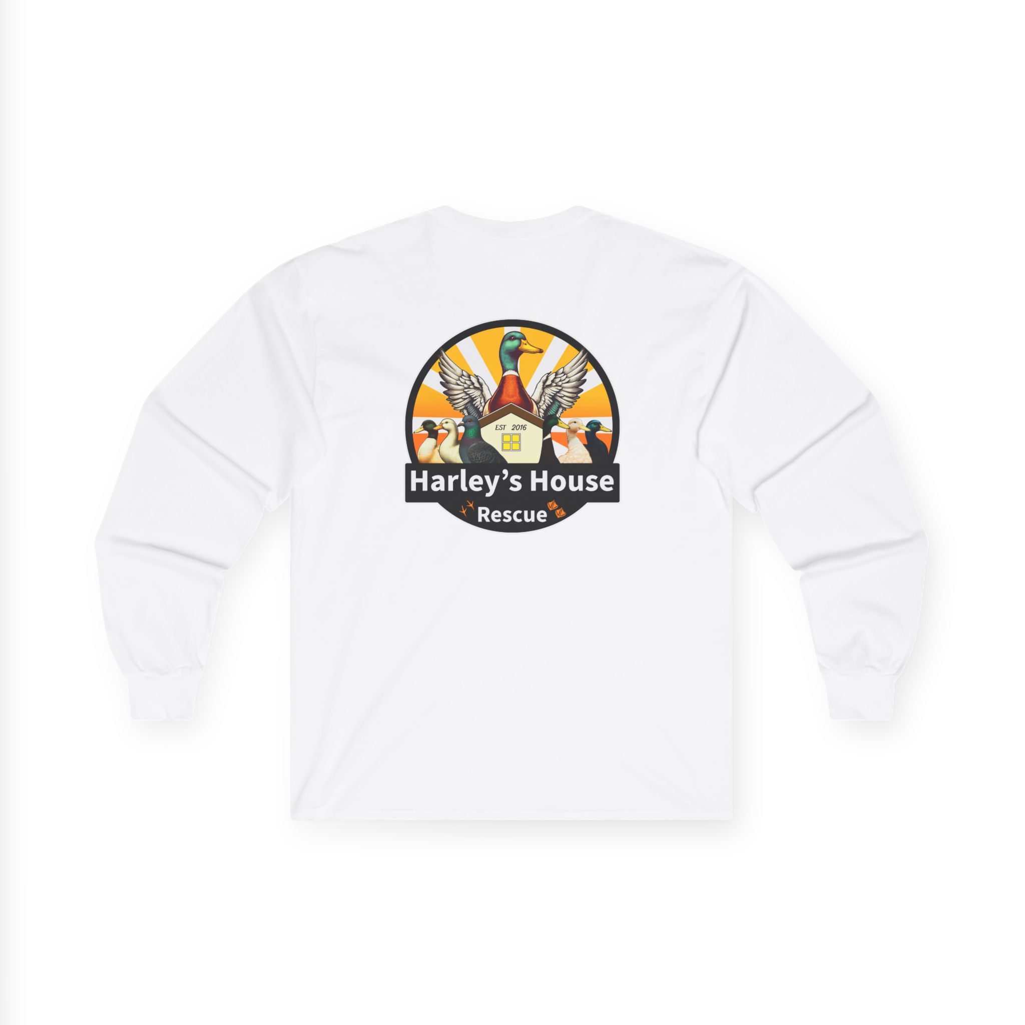 Support the Harley’s House Rescue non-profit domestic duck rescue with this Unisex Jersey Long Sleeve Tee featuring our logo. All proceeds go towards supporting care for the rescue ducks and pigeons. Perfect for animal lovers and those passionate about animal welfare. Ideal for casual wear or as a statement piece to show support for a good cause. Relevant for animal rescue events, charity fundraisers, and animal advocacy campaigns.